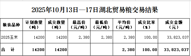 本周湖北贸易粮成交2025玉米14200,成交率100%,成交均价2380/吨。